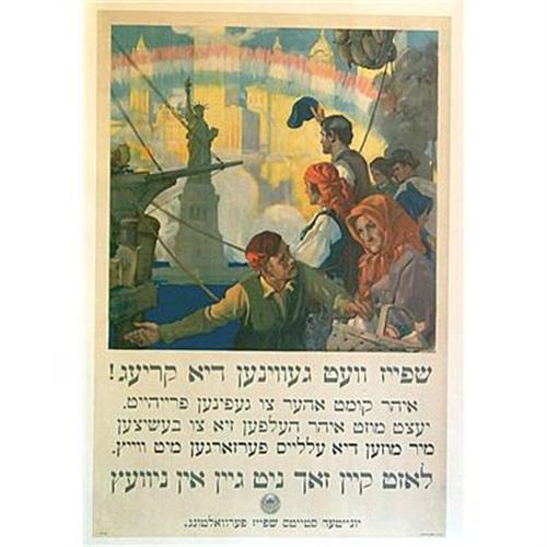ORIGINAL 1918 YIDDISH VERSION OF WORLD WAR ONE CONSERVATION POSTER ENTITLED "FOOD WILL WIN THE WAR", BY CHAMBERS. ILLUSTRATION OF IMMIGRANTS ARRIVING IN NEW YORK HARBOR, THE RED, WHITE, AND BLUE RAINBOW SYMBOLIZING OPPORTUNITY AND HOPE. ASKS NEWCOMERS TO HELP THEIR NEWLY ADOPTED NATION BY SAVING WHEAT FOR SHIPMENT TO EUROPE. SHIPPING PRICE  INCLUDES INSURANCE.