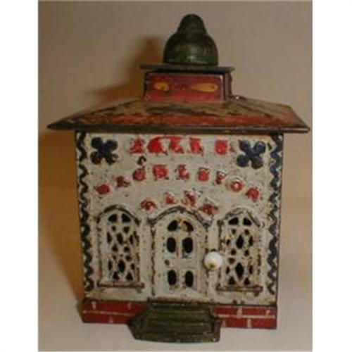 This is an original 1869 HALLS EXCELSIOR mechanical bank from the J.& E. STEVENS CO. of CROMWELL, CT. It is in very good condition, with no cracks breaks or repairs to the casting and there is no touch up to the original paint. It is unusual in that the tellers head is cast metal rather than the usual carved wooden type. The bank is stamped, PAT. DEC 21, 1869.