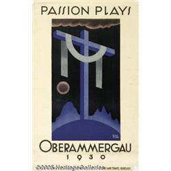<B>Passion Play (H. Sonnett, Germany, 1930)</B></I> Travel Poster ( 23.5" X 40"). Issued by the German government to promote the controversial passion play staged every ten years at Oberammergau. The stylized art deco design (by Rich Klein) seems incongruous when combined with the powerful Christian symbol, but the poster works to create a haunting mood, perhaps pre-figuring the dread era Germany was about to enter. Artist Rich Klein. Very Fine condition.