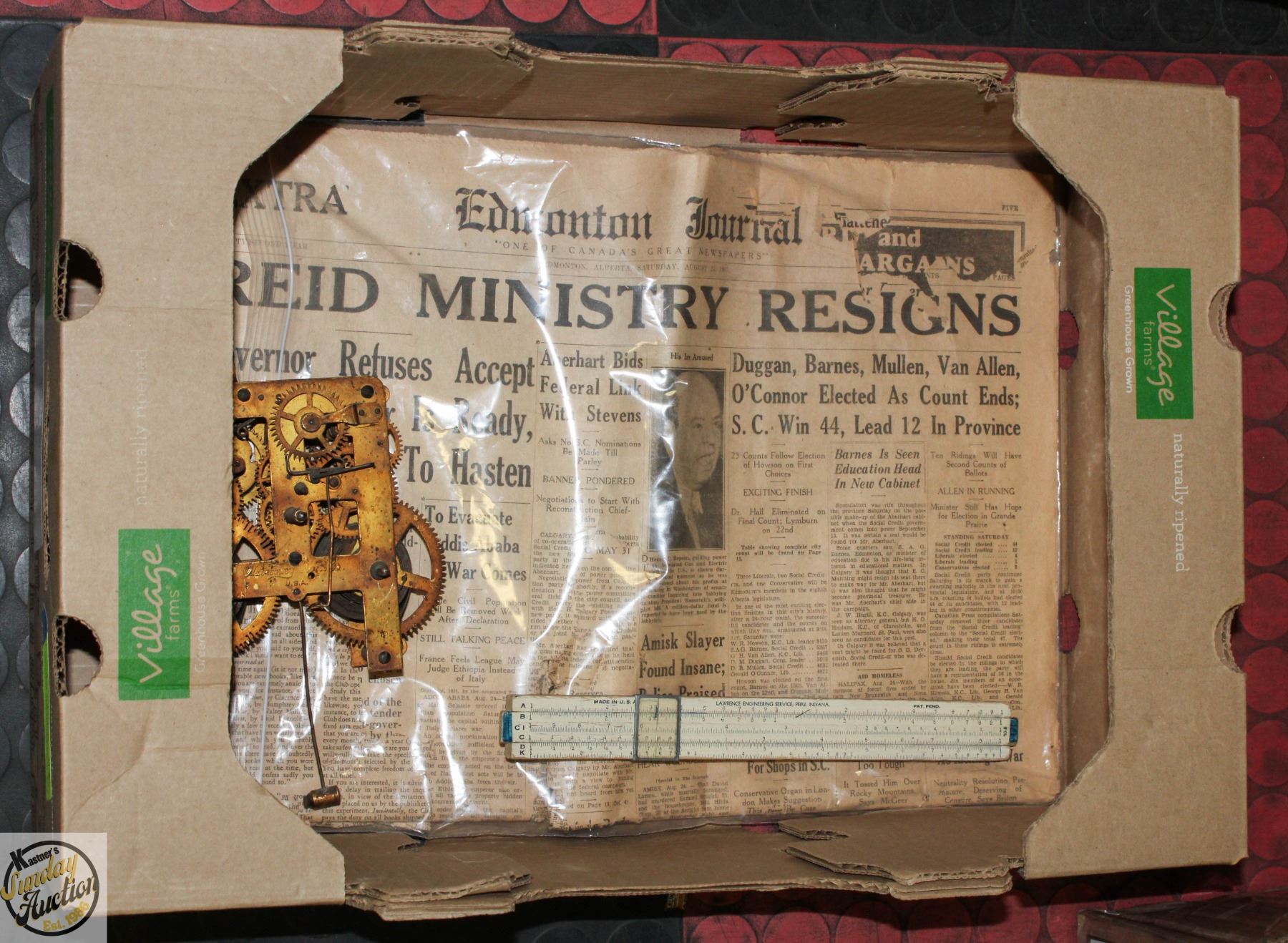 ANTIQUE WATERBURYS CLOCK CO SOLID BRASS GEARS + LAWRENCE ENGINEERING SERVICE PERU INDIANA PATENT PENDING SLIDE RULER **ALL ITEMS MUST BE REMOVED BY 5PM SATURDAY, MAY 31ST 2025. ALL REMAINING ITEMS WILL BE SUBJECT TO A $6.00 PER DAY STORAGE CHARGE. ANY ITEMS REMAINING AFTER MONDAY, JUNE 16TH 2025 WILL BE CONSIDERED FORFEITED. NO REFUNDS WILL BE ISSUED FOR FORFEITED ITEMS. TO SCHEDULE A PICK UP APPOINTMENT CLICK HERE