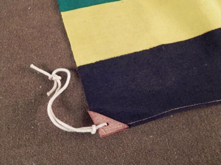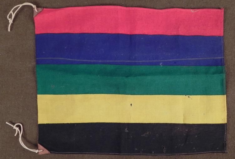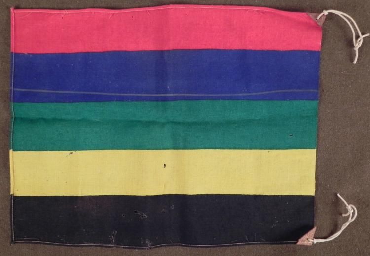 HERE IS AN ORIGINAL 1936 NAZI GERMANY OLYMPICS 14X17" FLAG: RED, BLUE, GREEN, YELLOW & BLACK. THE 5 COLORS REPRESENT RINGS ON OLYMPIC SYMBOLS. THEY ALSO REPRESENT AT LEAST ONE COLOR IN ALL PARTICIPATING COUNTRIES FLAGS. IT IS MADE OUT OF COARSE WOOL WITH TWO CORNERS THAT HAVE REINFORCED LEATHER TRIANGLES AND STRING TIES. THIS IS A NICE, RARE ORIGINAL NAZI OLYMPIC FLAG THAT HAS SOME AGE AND SOME MOTHING. *