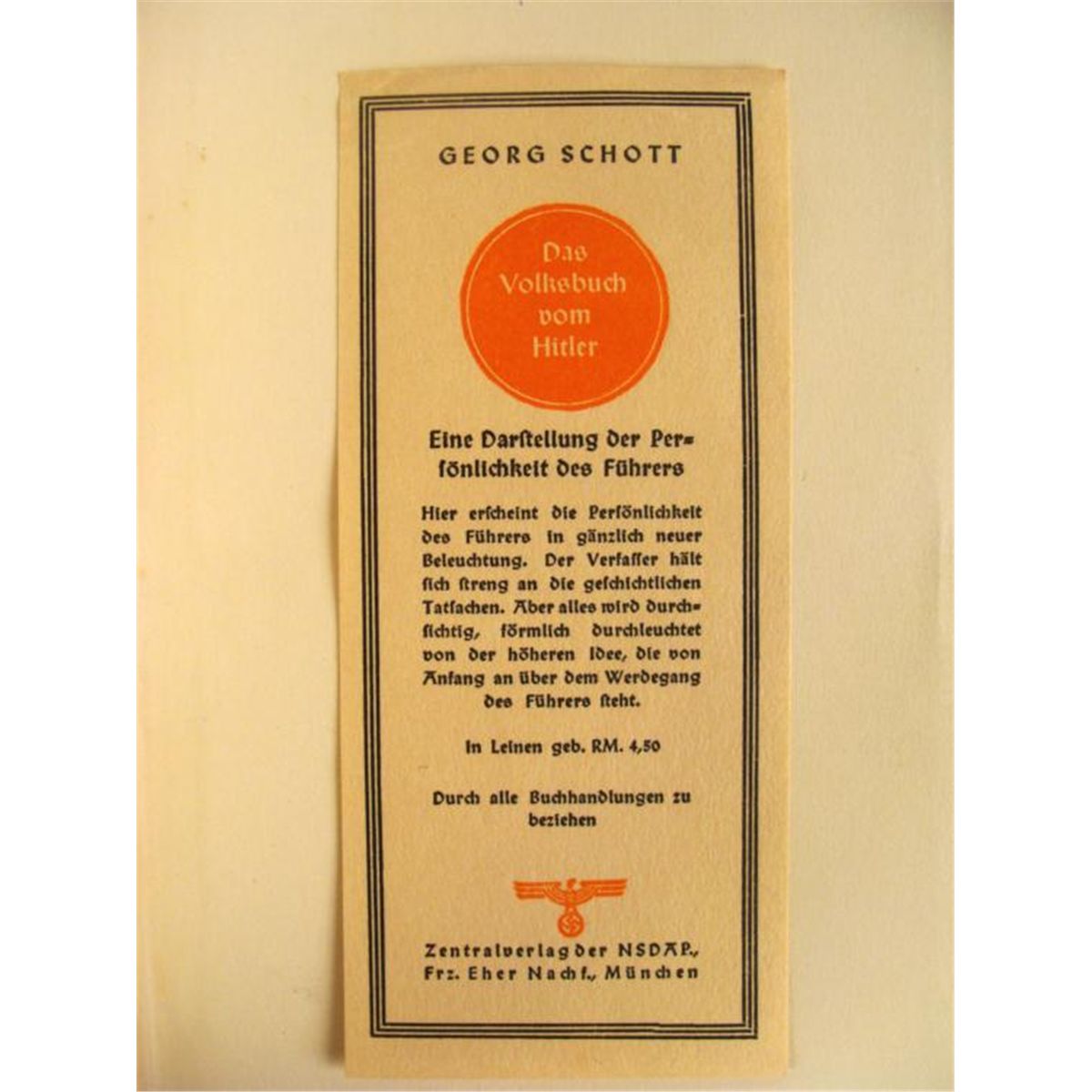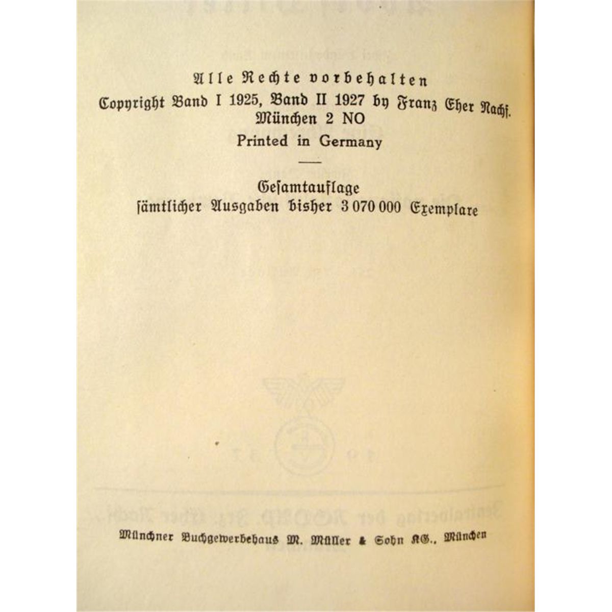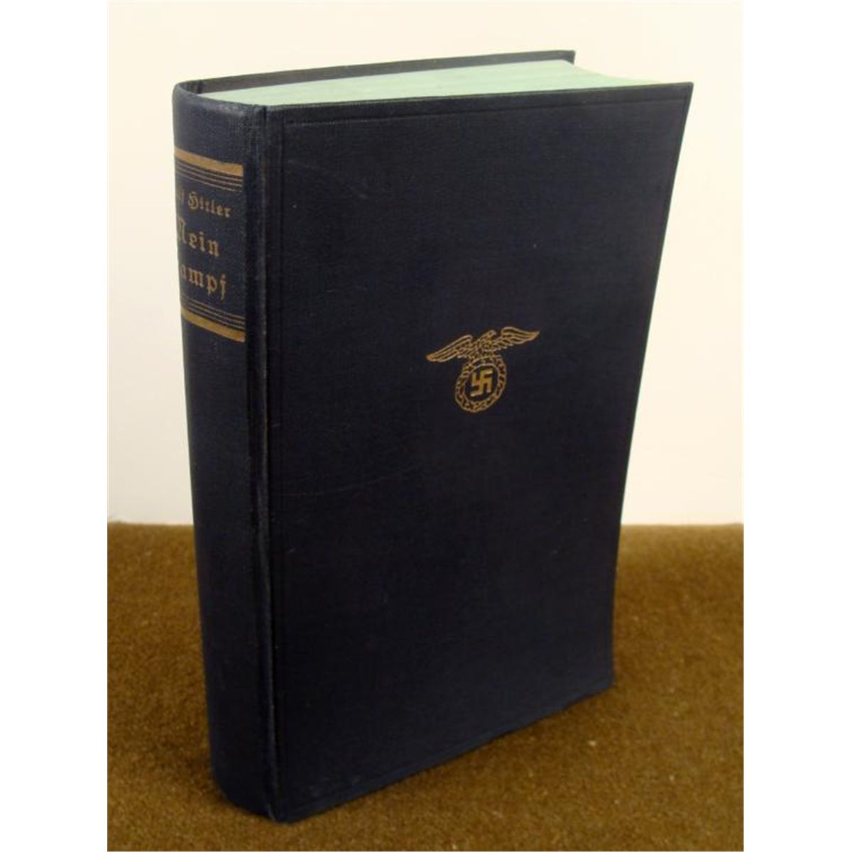 THIS IS AN ORIGINAL 1937 NAZI EDITION OF ADOLF HITLER'S MEIN KAMPF. * * THE BOOK HAS A BLUE HARDCOVER WITH AN EARLY GOLD EAGLE AND SWASTIKA ON THE FRONT COVER. IT HAS THE NAZI NSDAP BOOKMARK INSIDE THE FRONT COVER THAT WAS INCLUDED WHEN BOOK WAS PURCHASED. THERE IS A HITLER PHOTO AND FACSIMILE SIGNATURE UNDERNEATH. THE BOOK IS IN EXCELLENT CONDITION. * *