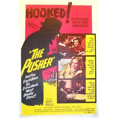 ORIGINAL 1958-1959 UNITED ARTISTS POSTER FOR MOVIE FOR MOVIE "THE PUSHER", A PIECE ABOUT THE DANGERS OF DRUGS. BASED ON QUOTES, INNOCENT BY TODAY'S STANDARDS. 41.5" X 27". CONDITION: GOOD, A-, FOLD LINES, MINOR RESTORATION IN MARGIN (NOT IN IMAGE), CONSERVATION MOUNTED ON CANVAS. SHIPPING PRICE INCLUDES INSURANCE IN USA, WILL TRY TO INSURE WITH OVERSEAS BUYERS, SUBJECT TO OUR DISCRETION. WE USE USPS.