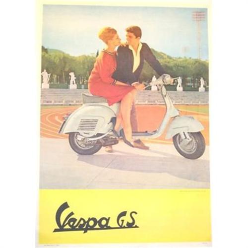 ORIGINAL C. 1965 VESPA G.S. MOTOSCOOTER ADVERTISEMENT FROM ITALY. GREAT, HIP SIXTIES LOOK! 39.25" X 27.25". EXCELLENT CONDITION, CONSERVATION MOUNTED ON CANVAS. SHIPPING PRICE INCLUDES INSURANCE IN USA. WILL BE AS FAIR AS POSSIBLE WITH OVERSEAS BUYERS. OVERSEAS SHOULD EXPECT UPS.