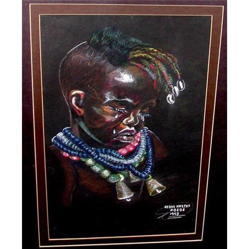 ORIGINAL AFRICAN PASTEL PORTRAIT OF A CRYING CHILD<P>A magnificent and large portrait painting of a tearful African child in colorful shades of blue, red, white, green and brown pastels on a black ground. The child is adorned with several bright beaded necklaces with bells and attractive hair braids. The artist has lovingly captured the tender yet powerful emotions of childhood in this rare intimate portrait. <p> The artist has signed this painting in the lower right corner (see photos): 'GEBRE KRSTOS ABEBE 1958'. The condition of this painting is perfect, although the black frame has several minor scratches and rubbing due to age. The piece is double-matted in matching colors.