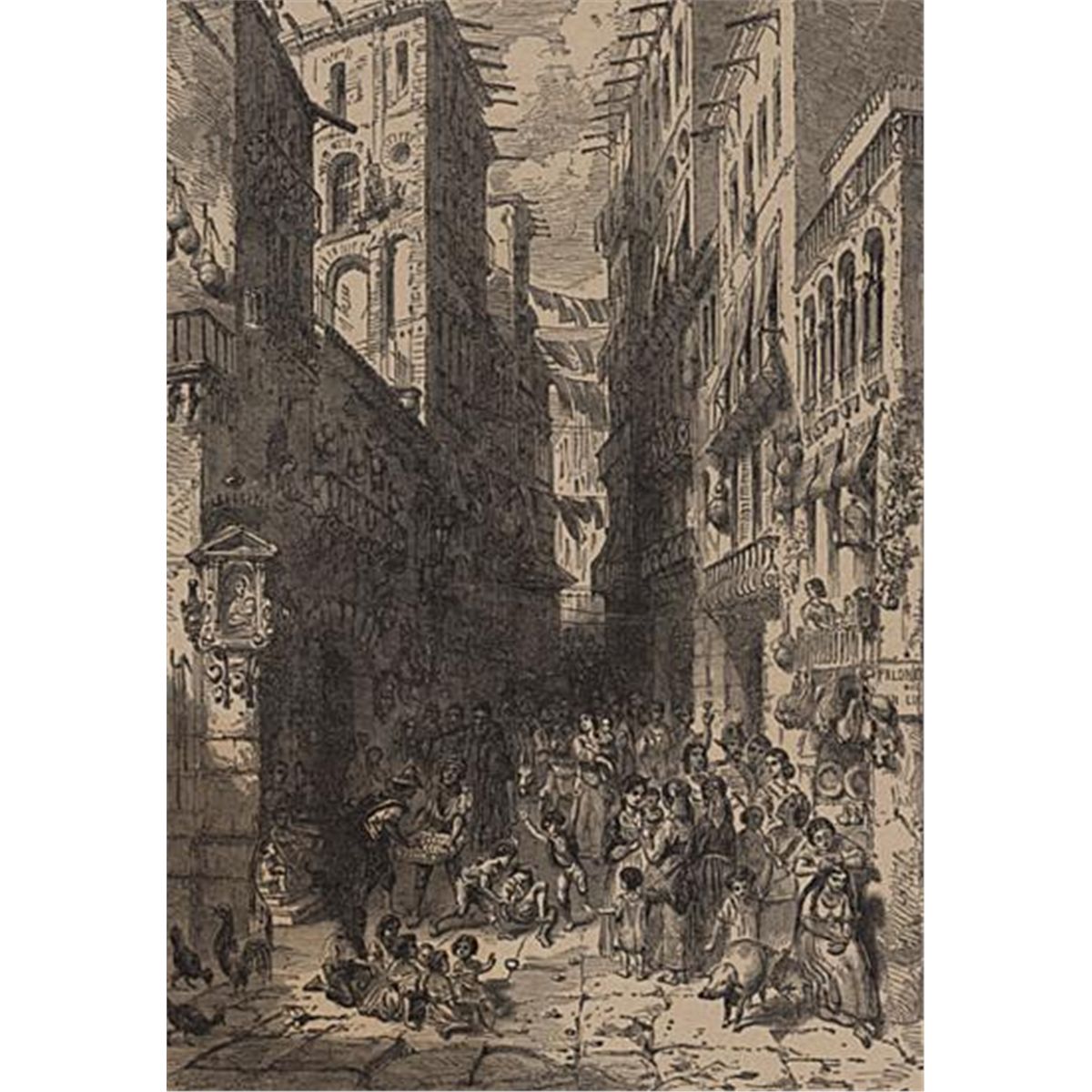 ORIGINAL Antique PRINT scene-A STREET IN NAPLES (NOT A REPRODUCTION) that was createdand produced, using a wood cut (Scene carved out of a wood block). One of several that were found in an 1858 Southern Antebellum mansion, all being offered for sale. Condition is excellent PLUS! Measures 10in x 7.5in.