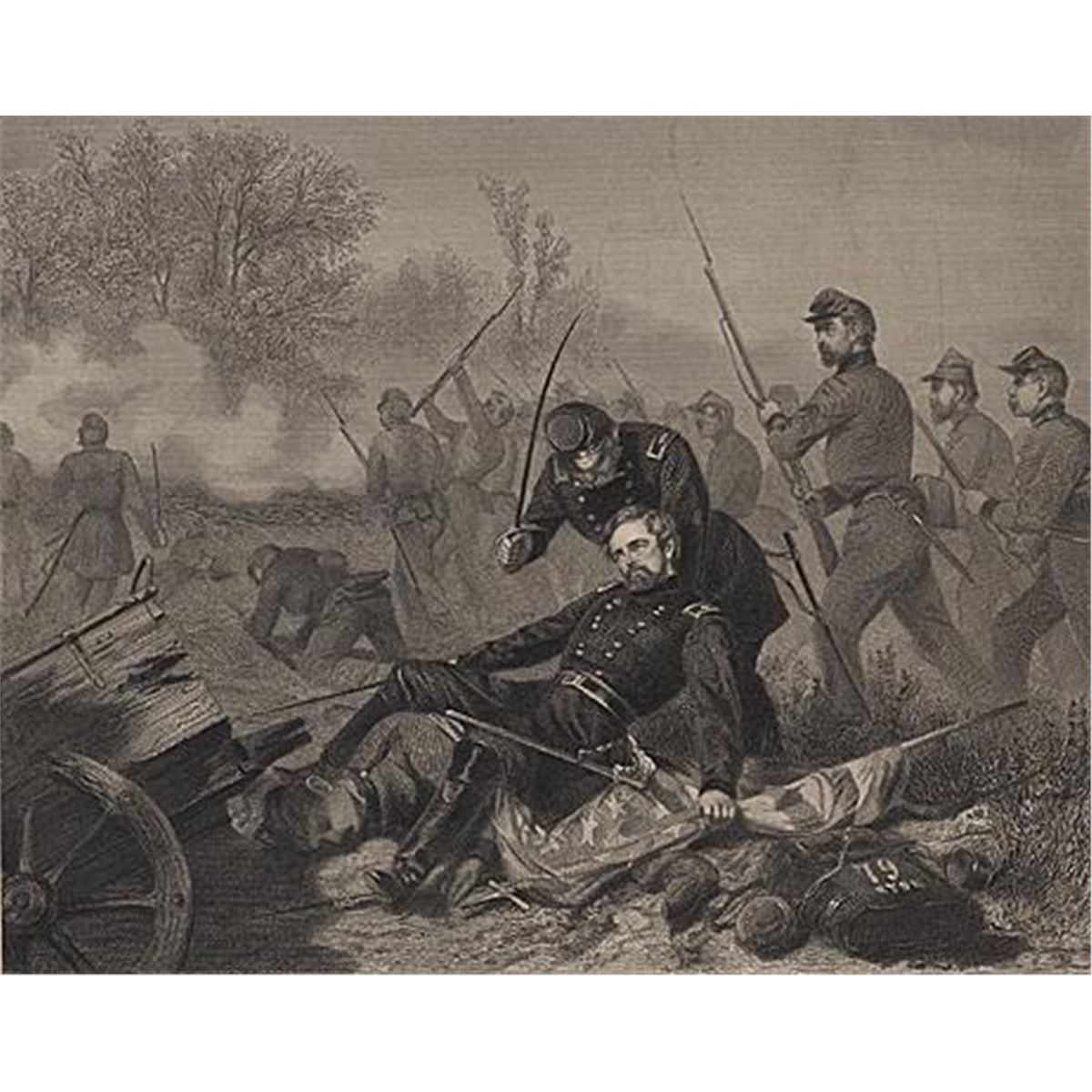 ORIGINAL Antique PRINT scene-ATTACK AT CHATILLY-DEATH OF GEN. STEVENS (NOT A REPRODUCTION) that was createdand produced, using a wood cut (Scene carved out of a wood block). One of several that were found in an 1858 Southern Antebellum mansion, all being offered for sale. Condition is excellent PLUS! Measures 8in x 10.75in.