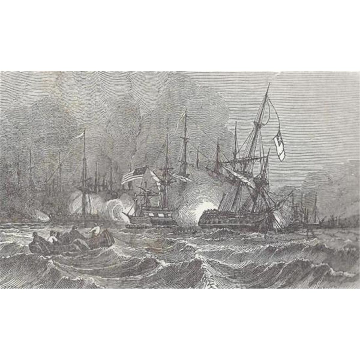 ORIGINAL Antique PRINT scene -BATTLE ON LAKE CHAMPLAIN (NOT A REPRODUCTION) that was createdand produced, using a wood cut (Scene carved out of a wood block). One of several that were found in an 1858 Southern Antebellum mansion, all being offered for sale. Condition is excellent PLUS! Measures 8.75in x 5.5in.