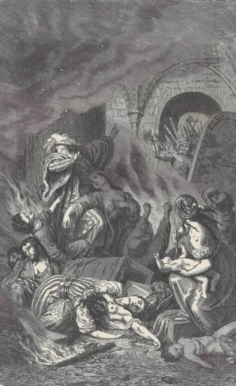 ORIGINAL Antique PRINT scene-DEATH OF THE RABBI AND THE JEWS IN YORK (NOT A REPRODUCTION) that was createdand produced, using a wood cut (Scene carved out of a wood block). One of several that were found in an 1858 Southern Antebellum mansion, all being offered for sale. Condition is excellent PLUS! Measures 7.5in x 10in.