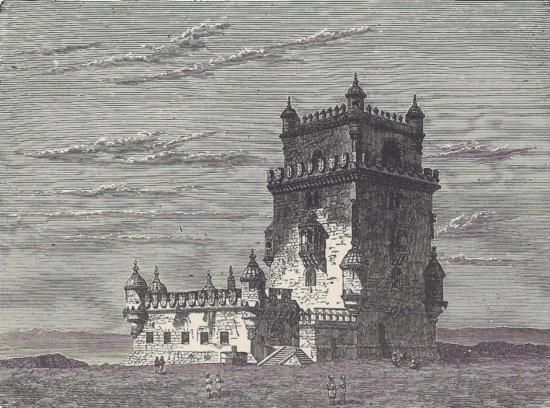 ORIGINAL Antique PRINT scene-FEUDAL CASTLE OF BELEM, PORTUGAL(NOT A REPRODUCTION) that was createdand produced, using a wood cut (Scene carved out of a wood block). One of several that were found in an 1858 Southern Antebellum mansion, all being offered for sale. Condition is excellent PLUS! Measures 7.5in x 10in.
