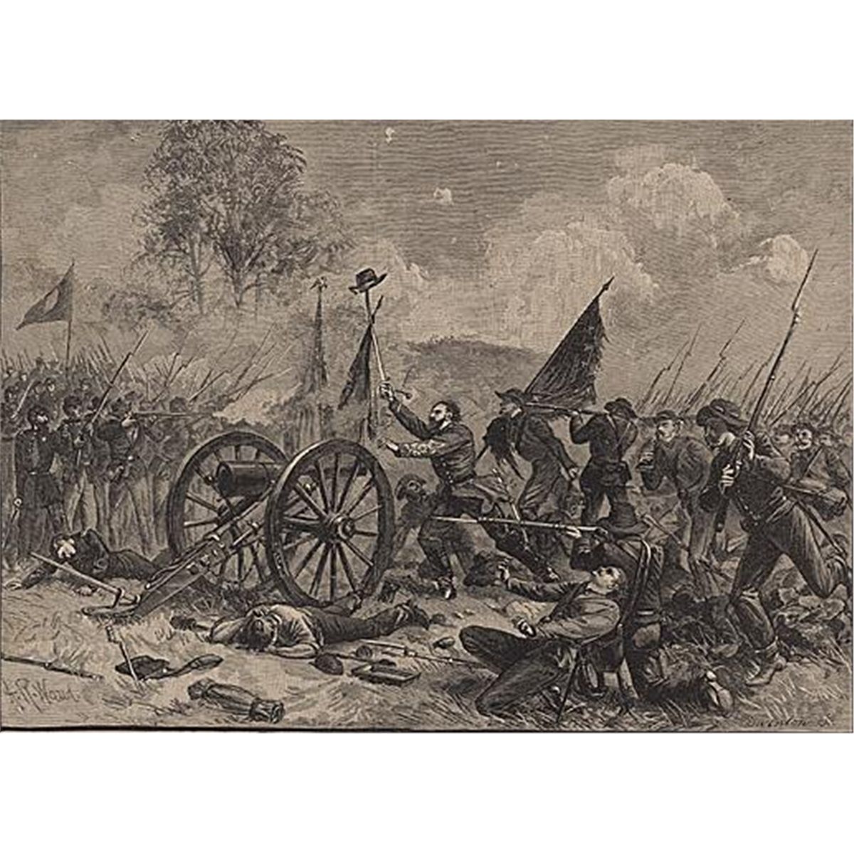 ORIGINAL Antique PRINT scene- PICKETT'S CHARGE AT GETTYSBURG (NOT A REPRODUCTION) that was createdand produced, using a wood cut (Scene carved out of a wood block). One of several that were found in an 1858 Southern Antebellum mansion, all being offered for sale. Condition is excellent PLUS! Measures 7.5in x 10in.