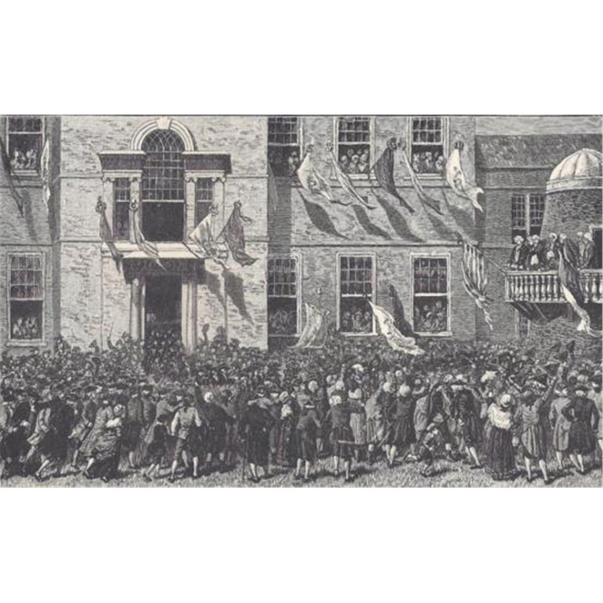 ORIGINAL Antique PRINT scene- READING OF THE DECLARATION OF INDEPENDENCE IN PHILADELPHIA (NOT A REPRODUCTION) that was createdand produced, using a wood cut (Scene carved out of a wood block). One of several that were found in an 1858 Southern Antebellum mansion, all being offered for sale. Condition is excellent PLUS! Measures 6.5in x 9.75in.