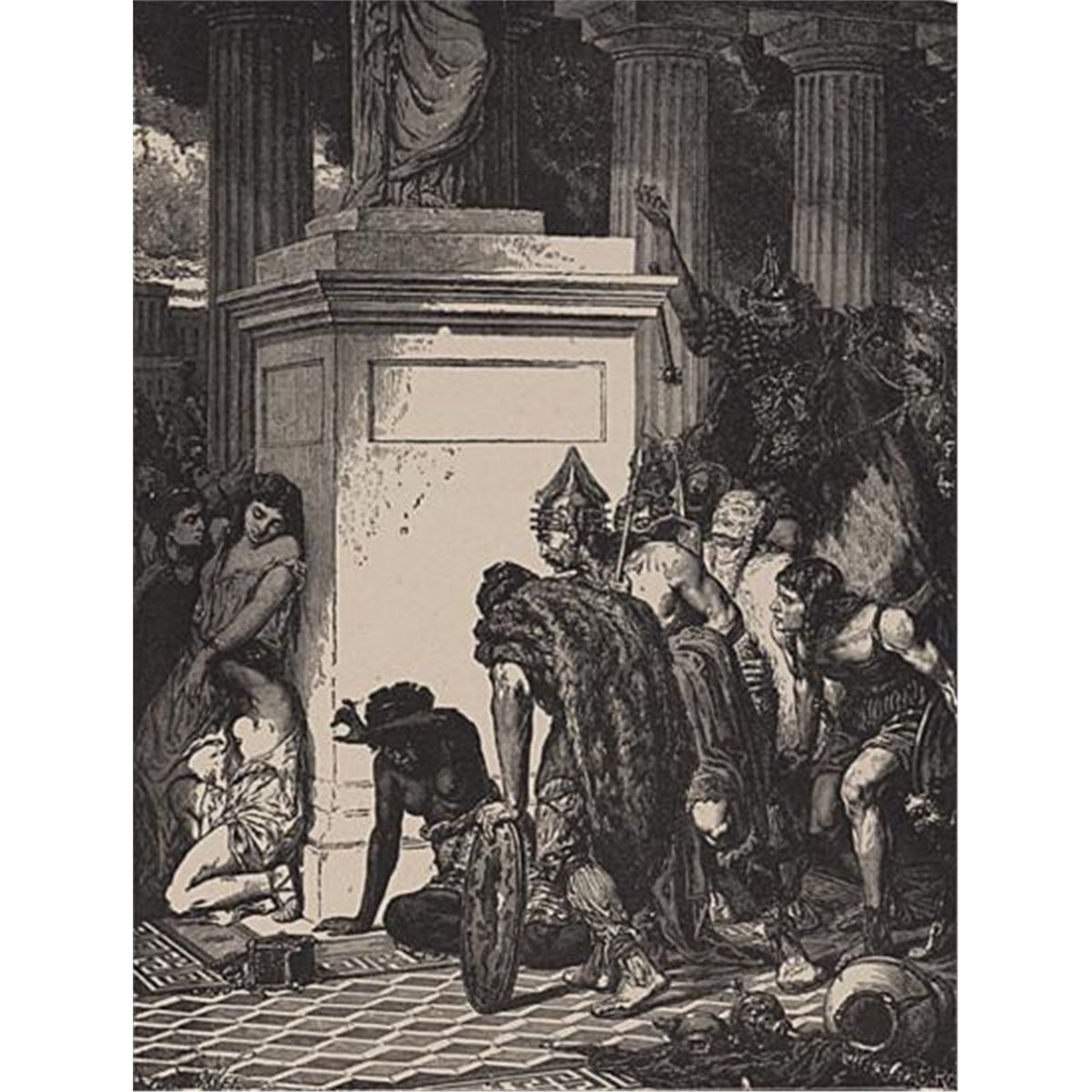 ORIGINAL Antique PRINT scene- ROME PLUNDERED BY THE GAULS (NOT A REPRODUCTION) that was createdand produced, using a wood cut (Scene carved out of a wood block). One of several that were found in an 1858 Southern Antebellum mansion, all being offered for sale. Condition is excellent PLUS! Measures 7.5in x 10in.