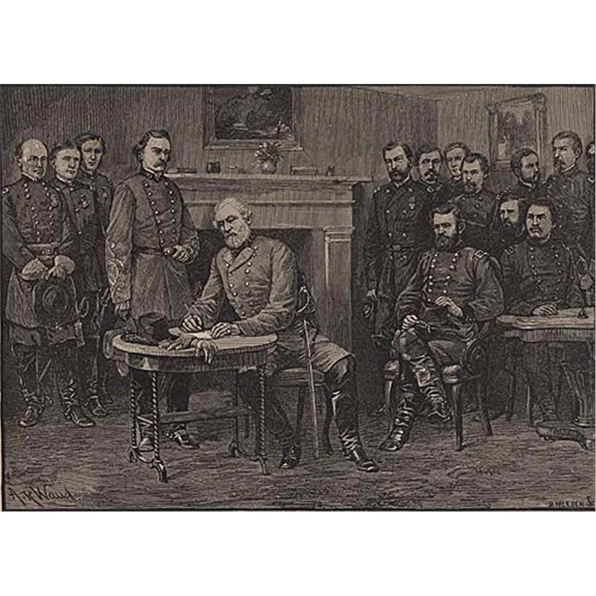 ORIGINAL Antique PRINT scene- SURRENDER OF GENERAL LEE (NOT A REPRODUCTION) that was createdand produced, using a wood cut (Scene carved out of a wood block). One of several that were found in an 1858 Southern Antebellum mansion, all being offered for sale. Condition is excellent PLUS! Measures 7.5in x 10in.