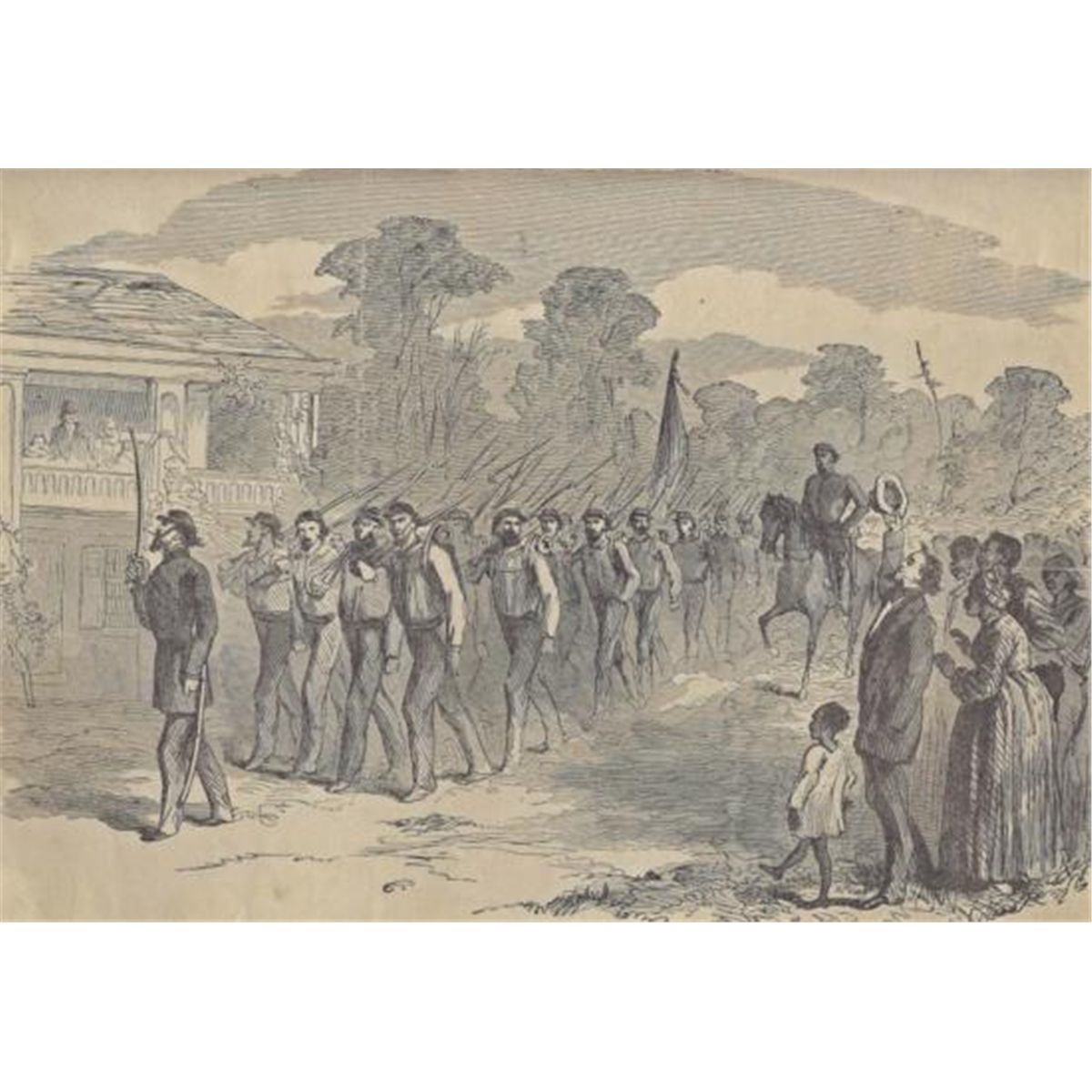 ORIGINAL Antique PRINT scene Volunteers on the March for Charleston SC (NOT A REPRODUCTION) that was createdand produced, using a wood cut (Scene carved out of a wood block). One of several that were found in an 1858 Southern Antebellum mansion, all being offered for sale. Condition is excellent PLUS! mwf2165