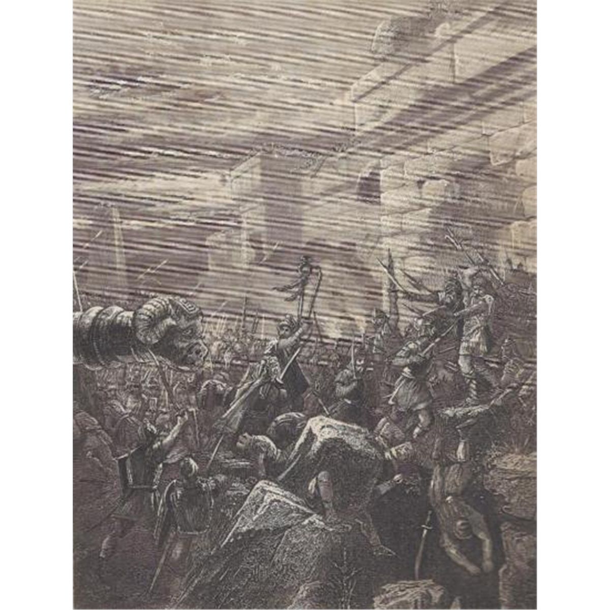ORIGINAL Antique PRINT scene-WAR IN ANCIENT TIMES (NOT A REPRODUCTION) that was createdand produced, using a wood cut (Scene carved out of a wood block). One of several that were found in an 1858 Southern Antebellum mansion, all being offered for sale. Condition is excellent PLUS! Measures 10.5in x 6.75in.