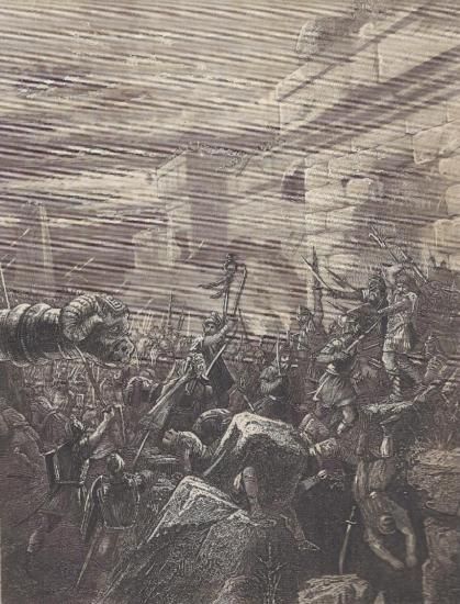 ORIGINAL Antique PRINT scene-WAR IN ANCIENT TIMES (NOT A REPRODUCTION) that was createdand produced, using a wood cut (Scene carved out of a wood block). One of several that were found in an 1858 Southern Antebellum mansion, all being offered for sale. Condition is excellent PLUS! Measures 10.5in x 6.75in.