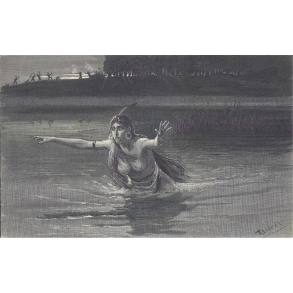 ORIGINAL Antique PRINT scene- WEETAMOO SWIMMING THE MATAPOISET (NOT A REPRODUCTION) that was createdand produced, using a wood cut (Scene carved out of a wood block). One of several that were found in an 1858 Southern Antebellum mansion, all being offered for sale. Condition is excellent PLUS! Measures 6.5in x 9.75in.