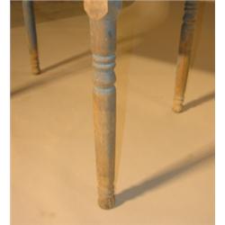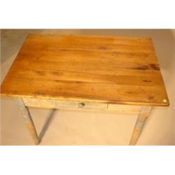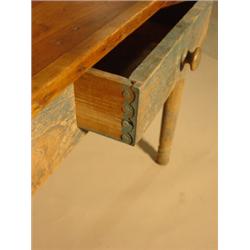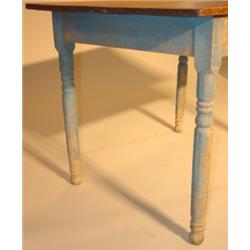 Original blue painted single drawer farm table with turned legs. Top has been refinished. 29" H, 42" x 28"