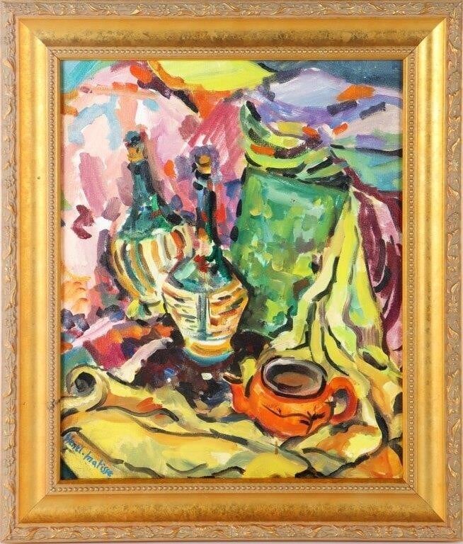 French painter Henri Matisse (1869-1954) original bottles on a table still life oil painting on canvas done in the manner of Matisse.