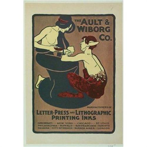 A SAMPLE OF PRINTING INK SHOWN IN LITHOGRAPH FORM -- AULT AND WIBORG PRINTING INK COMPANY ADVERTISENT FEATURING PAN AND A BARE BREASTED MAIDEN.