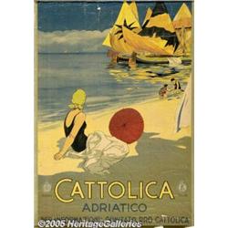 <B>Cattolica (ENIT, 1930)</B></I> Travel Poster (24.5" X 37"). The beach at Cattolica. A woman basks in the sun, watching the sailing ships, while two boys play in the sand. Old canvas mount. Nailed to wooden batten top and bottom. Fine condition on Canvas.