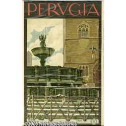 <B>Perugia (ENIT,Circa 1930)</B></I> Travel Poster (24.5" X 37"). Fountain at Perugia. Artwork by Alraci. Old canvas mount. Nailed to wooden batten top and bottom. Fine- condition on Canvas.
