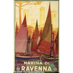 <B>Marina Di Ravenna (ENIT,Circa 1930)</B></I> Travel Poster (24.5" X 37"). Red sails in the sunset at the marina in Ravenna. Old canvas mount. Nailed to wooden batten top and bottom. Very Good+ condition on Canvas.