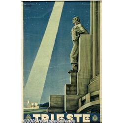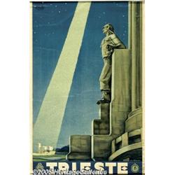 <B>Trieste (ENIT,Circa 1930)</B></I> Travel Poster (24.5" X 37"). A classic example of the overbearing and grandiose imagery of the Mussolini era. Not only does the design of this travel poster encapsulate that genre, the statue in the foreground typifies the Fascist neo-classicism that dominated Italian public spaces during the 1930s. Old canvas mount. Nailed to wooden batten top and bottom. Fine condition on Canvas.