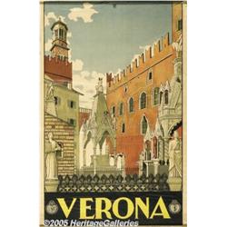 <B>Verona (ENIT,Circa 1930)</B></I> Travel Poster (24.5" X 37"). Town center of Verona with bell tower and statuary. Old canvas mount. Nailed to wooden batten top and bottom. Fine condition on Canvas.