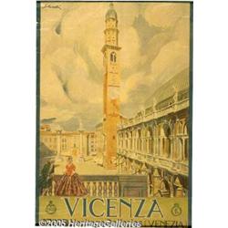<B>Vicenza (ENIT,Circa 1930)</B></I> Travel Poster (24.5" X 37"). St. Mark's in Venice with a couple in period costume in foreground. Artwork by Tullio Silvestri. Old canvas mount. Nailed to wooden batten top and bottom. Fine+ condition on Canvas.