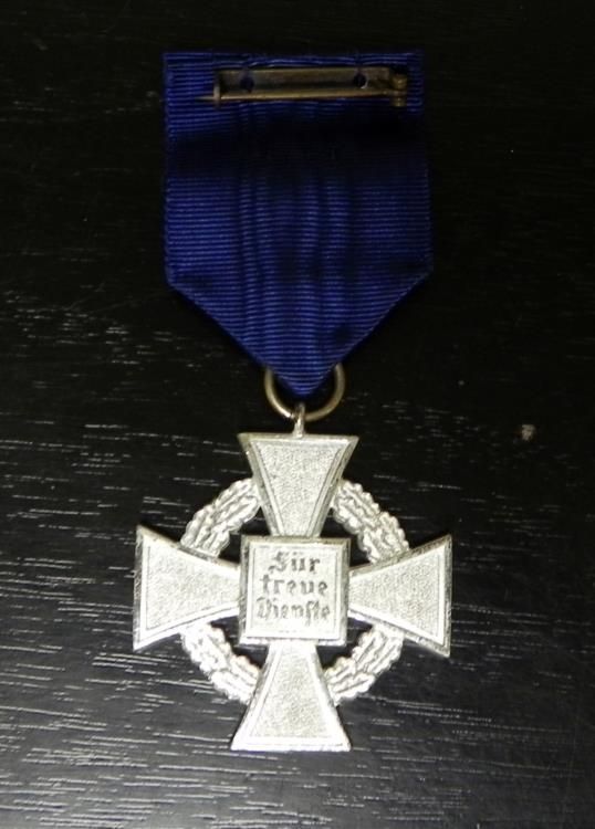 HERE IS A CASED NAZI 25 YEAR FAITHFUL SERVICE AWARD. IT IS A BEAUTIFUL FROSTED MALTESE CROSS MEDAL WITH WREATH WITH BLACK ENAMEL SWASTIKA--CORNFLOWER BLUE RICBBON--PIN BACK--REVERSE OF MEDAL--FUR TREUE DIENST--RED CASE WITH "25" ON TOP--FABRIC LINED INNER TOP AND CASE INSIDE FITTED FOR MEDAL.