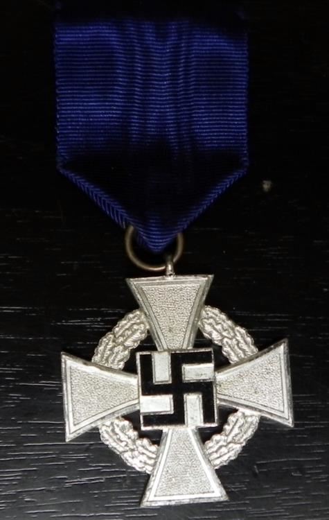 HERE IS A CASED NAZI 25 YEAR FAITHFUL SERVICE AWARD. IT IS A BEAUTIFUL FROSTED MALTESE CROSS MEDAL WITH WREATH WITH BLACK ENAMEL SWASTIKA--CORNFLOWER BLUE RICBBON--PIN BACK--REVERSE OF MEDAL--FUR TREUE DIENST--RED CASE WITH "25" ON TOP--FABRIC LINED INNER TOP AND CASE INSIDE FITTED FOR MEDAL.