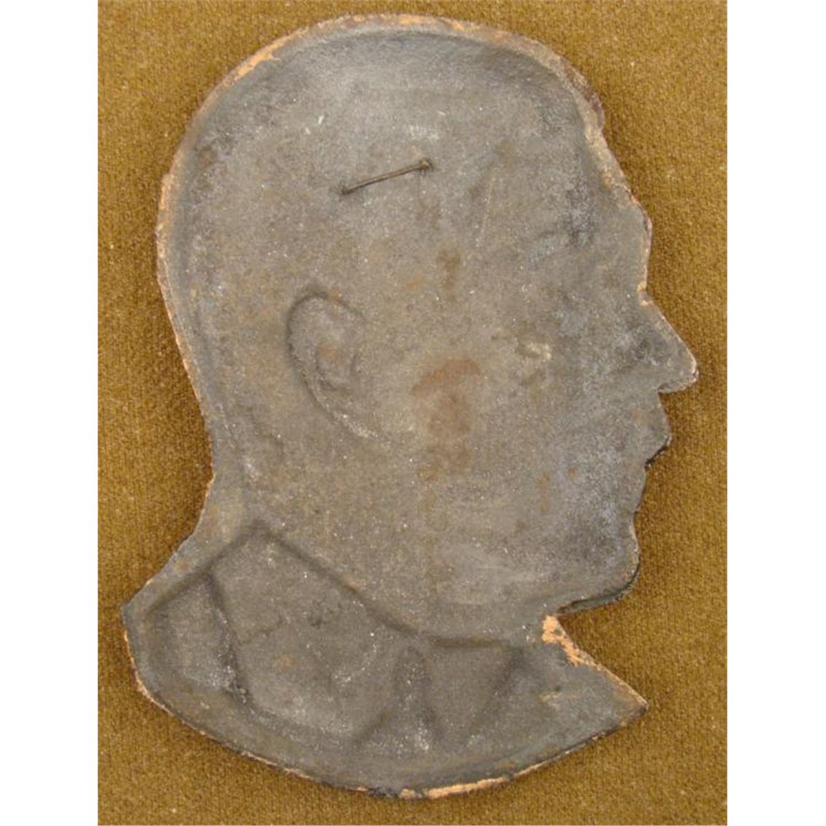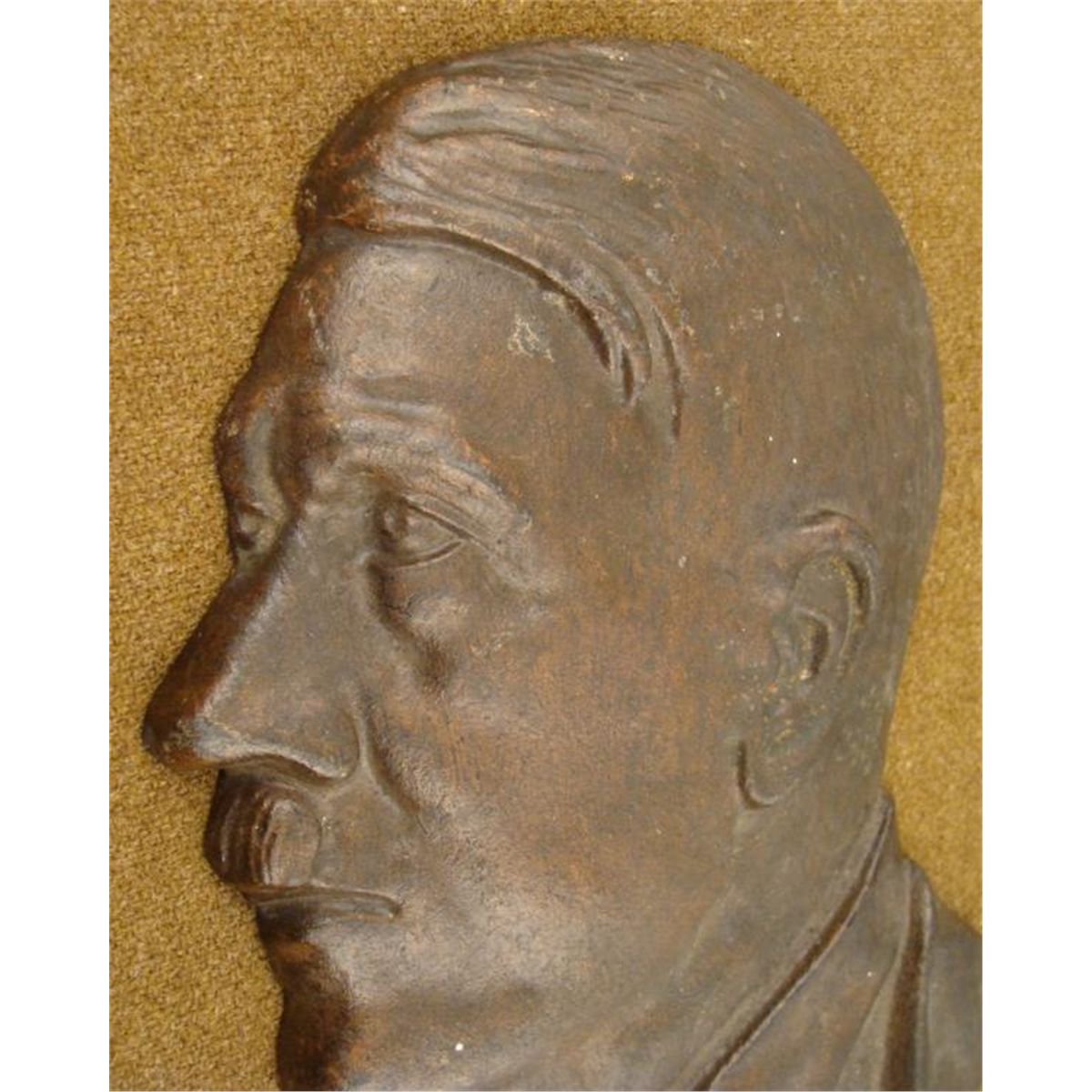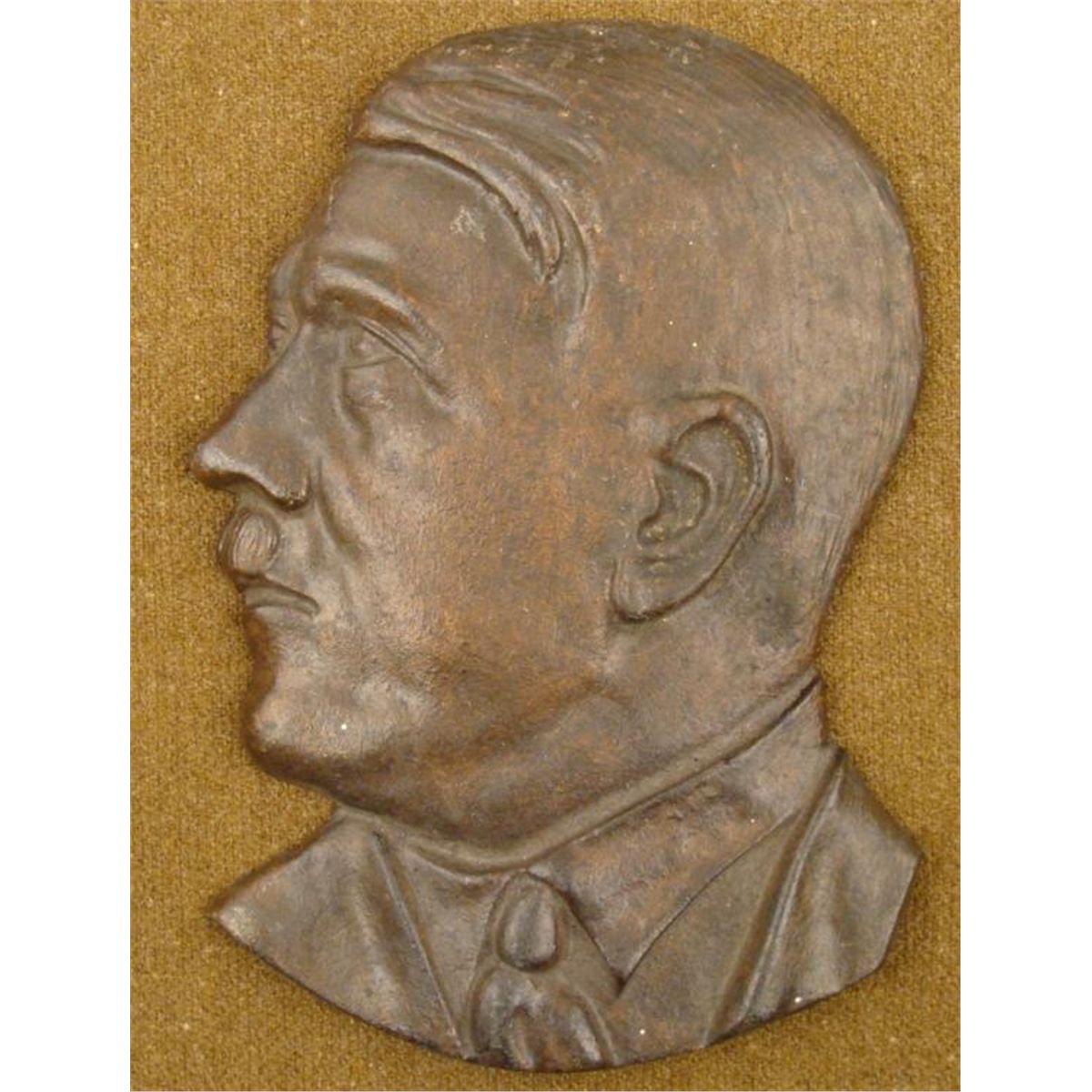 ORIGINAL CAST IRON ADOLF HITLER PROFILE BUST PLAQUE- 8X5 1/2"-GREAT DETAIL * MID-1930'S ADOLF HITLER CAST IRON PROFILE-CAST INTO THE REVERSE METAL IS A HANGING DEVICE-RARE PERIOD PIECE *