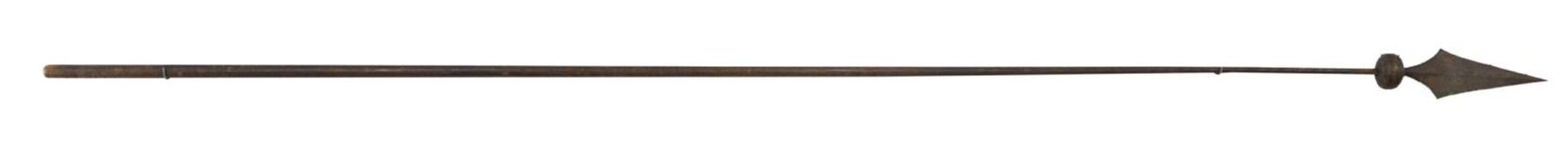 13 feet long, staff tapers from 1.5" to .75", soldered 2 piece embossed tinned sheet iron spear point finial is 15.5" and 5.5" wide, 4" wood ferrule. This amazing survivor, maybe only one in private hands was from collection of Jim Frasca who believed it was Confederate. Steve Mullinax had it in his collection for 20 years till his passing. There are tack remnants starting near ferrule running just over 5 feet. Many early Confederate National flags had these dimensions and standard Union colors were 6 feet on hoist. The first collector who bought this from Frasca in 1998 wanted it to be US, but sold it to Steve when Mullinax was convinced it was Confederate and brought back by Ohio troops as captured with unknown Confederate flag still in Ohio. CONDITION: very good overall, several dings and dents in well patinaed head. (02-19066/JS). $5,000-7,000.