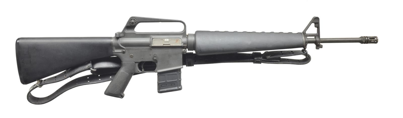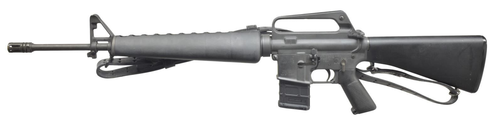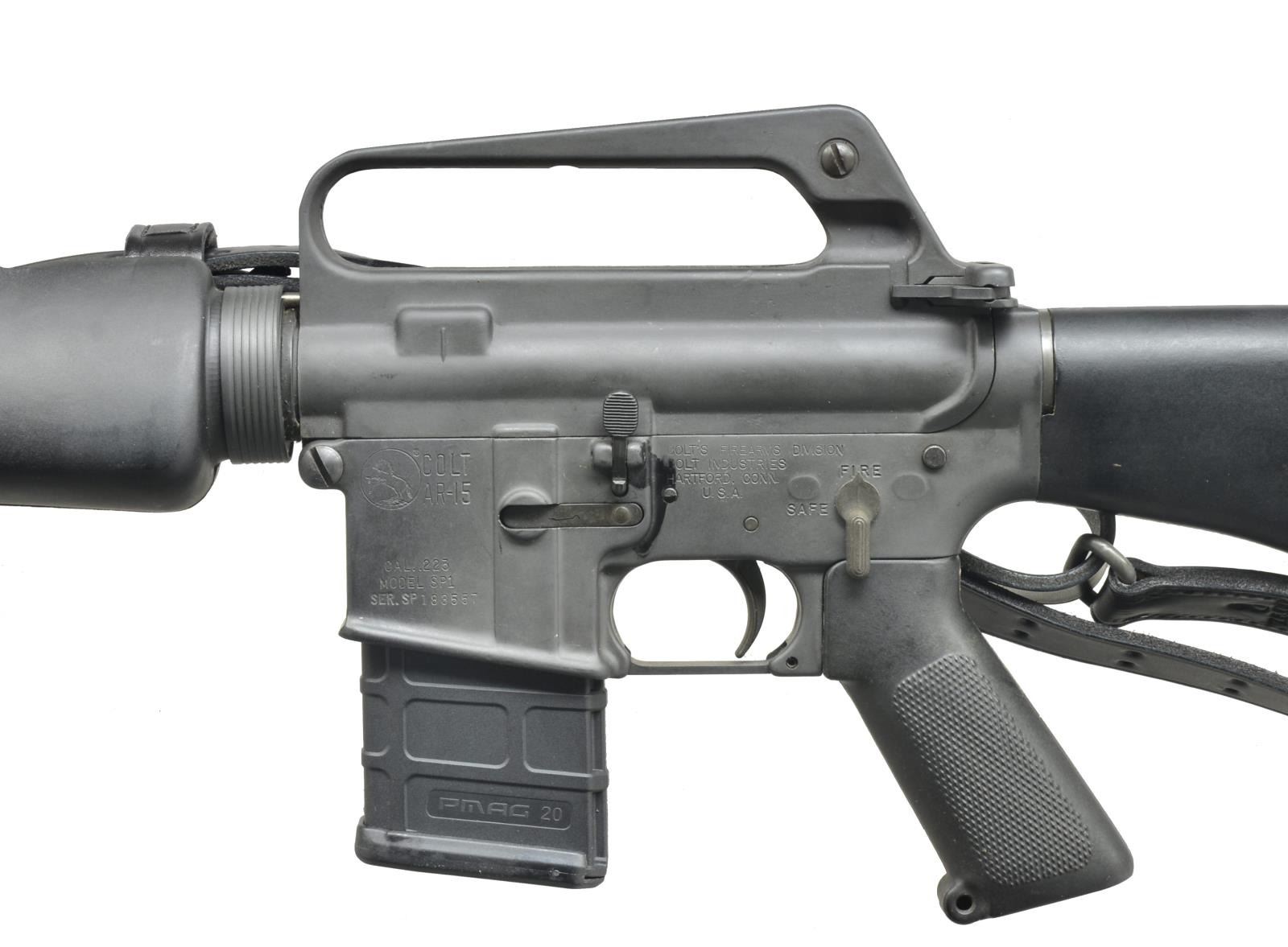 Cal. 223. S# SP183557. Bbl. 20". Original Colt AR-15 SP1 variant w/ beaver tail handguards. Straight wall delta ring. 10" Buttstock w/ trapdoor containing factory cleaning kit. Carry handle upper receiver w/ no brass deflector or forward assist. Slab side lower receiver w/ protected post front sight/bayonet lug & windage adj. rear peep sight. A2 style flash hider. Leather sling. SP1 style bolt carrier. Markings on left side include “COLT AR-15”, “CAL. .223 / MODEL SP1 / SER. SP1835587” & “COLT’S FIREARMS DIVISION / COLT INDUSTRIES / HARTFORD, CONN. / U.S.A.” MAGS: 1 “PMAG” 20 rds. CONDITION: original finish on both upper & lower receiver assemblies. Appears factory & lightly used. While the dust cover has earned a gentle patina, the receivers are free from any obvious blemish other than a dark paint streak emanating from bolt hold open device. Furniture appears in good condition w/ only storage type marks. Shiny bore w/ strong rifling. Fire control mechanism appears to function correctly when cycled by hand. PROVENANCE: The Estate of Richard Willman. (20-2372/JZ). MODERN. $900-1,500.