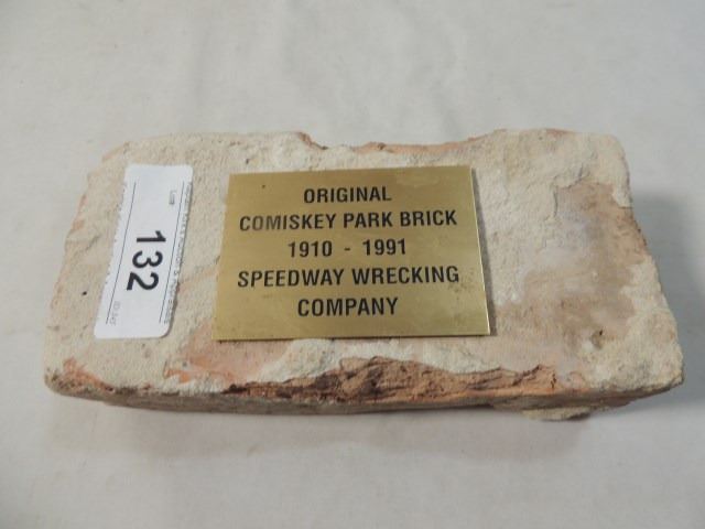 ORIGINAL BRICK FROM THE SPEEDWAY WRECKING COMPANY, FROM THE DEMOLITION OF THE OLD COMISKEY PARK. WITH BRASS NAMEPLATE, AS SHOWN.