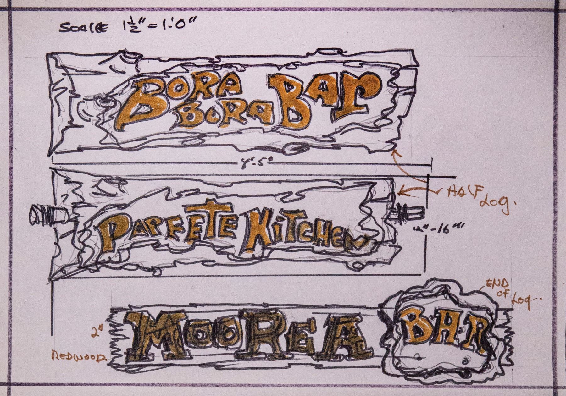 (1973) An original sketch by LeRoy Schmaltz for carved signage within Danny Balsz's fabulous Polynesian theme park THE TIKIS! 8.5"x11". VG+.