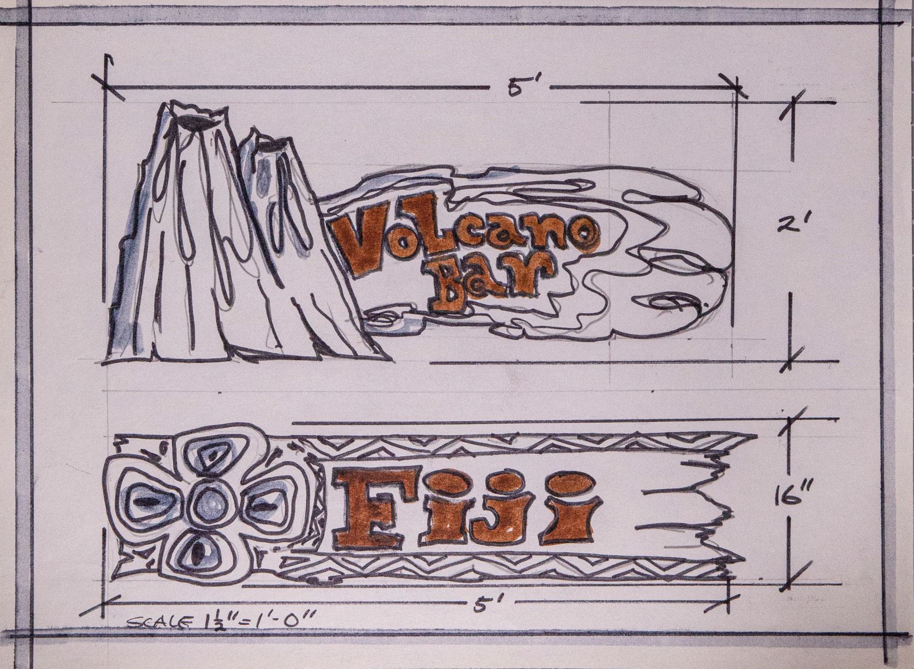 (1973) An original sketch by LeRoy Schmaltz for carved signage within Danny Balsz's fabulous Polynesian theme park THE TIKIS! 8.5"x11". VG+.