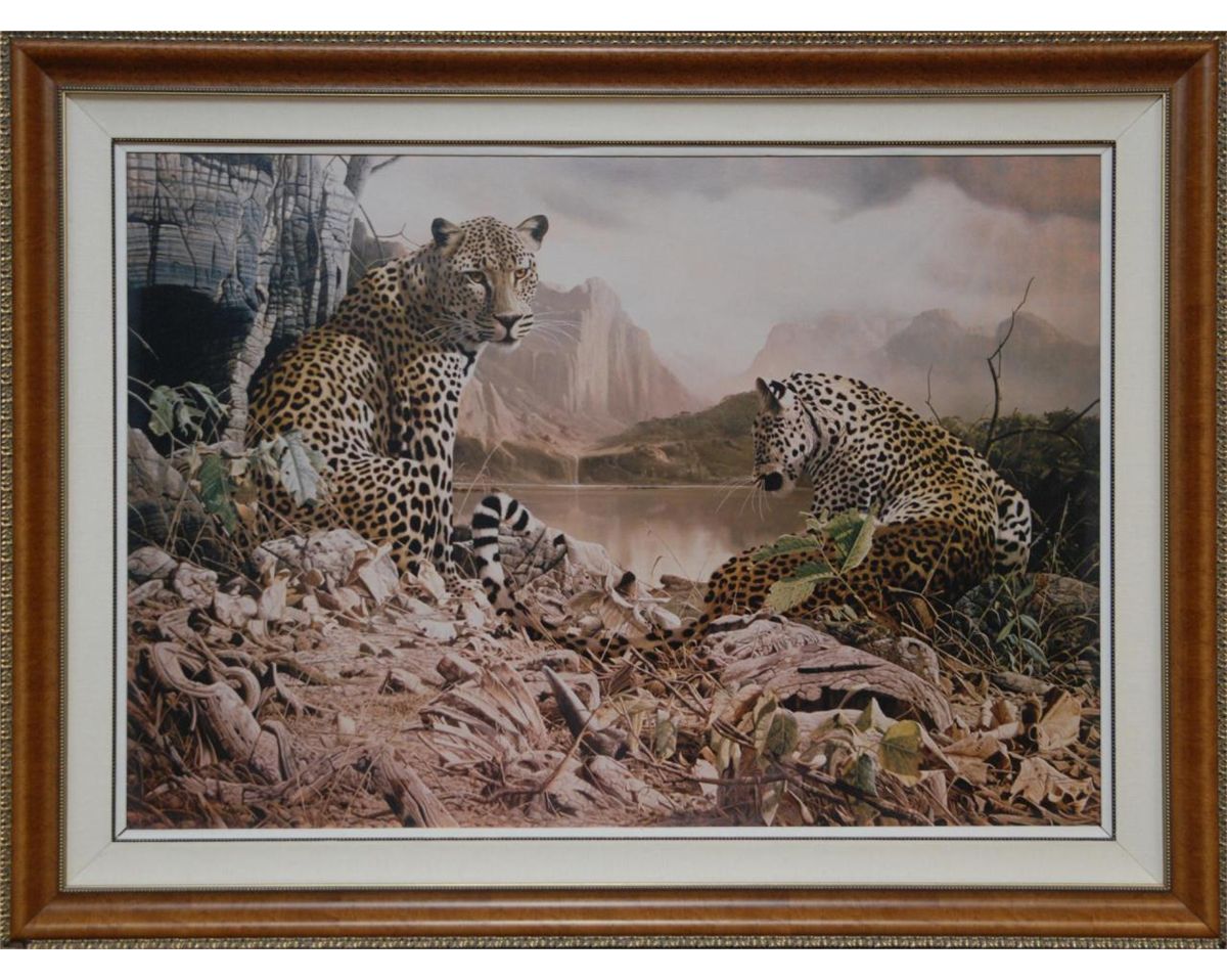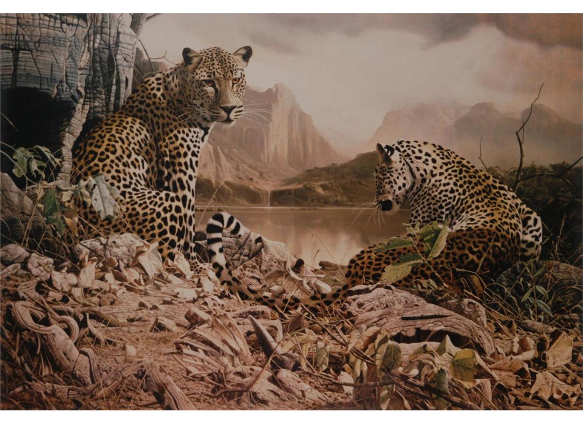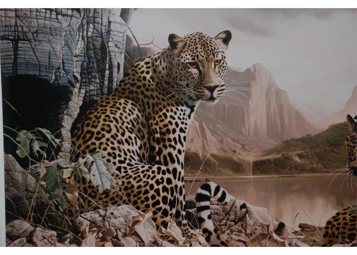 Craig Bone (ZIMBABWEAN, 1955) original large giclee depicting two leopards in the wild. Mounted in burl frame with beaded and leaf gilded design. Measures 41 3/4" height x 60" width + 6 1/2" (106cm x 152.4cm + 16.5cm).