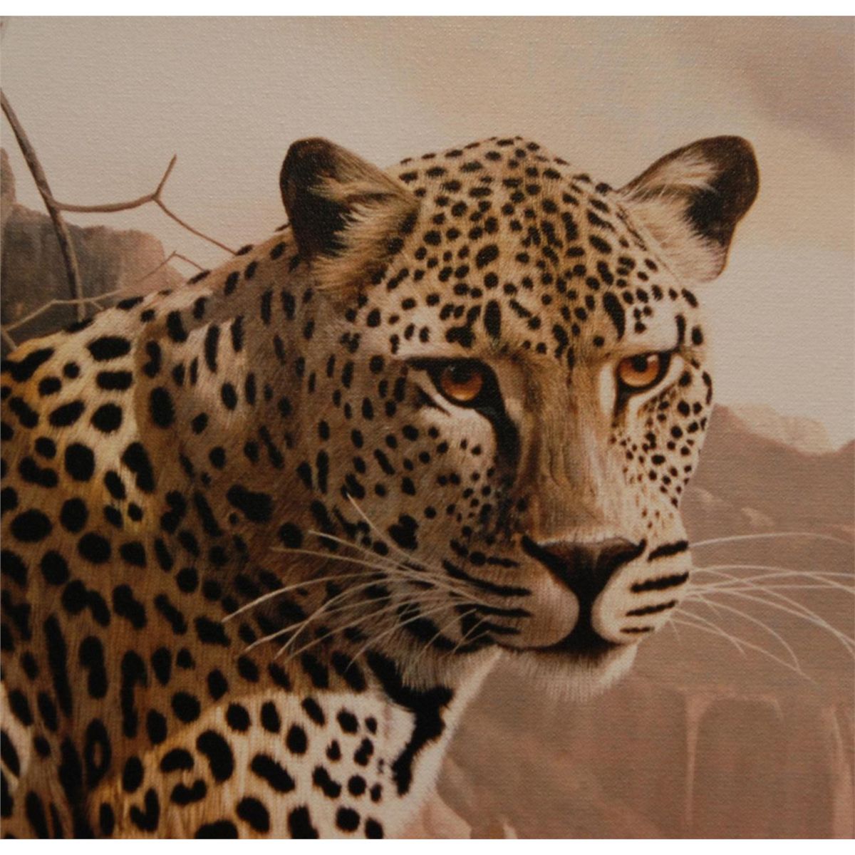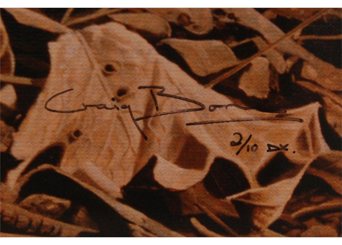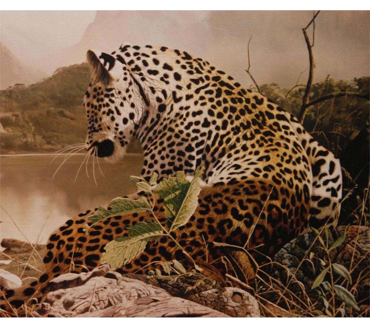 Craig Bone (ZIMBABWEAN, 1955) original large giclee depicting two leopards in the wild. Mounted in burl frame with beaded and leaf gilded design. Measures 41 3/4" height x 60" width + 6 1/2" (106cm x 152.4cm + 16.5cm).