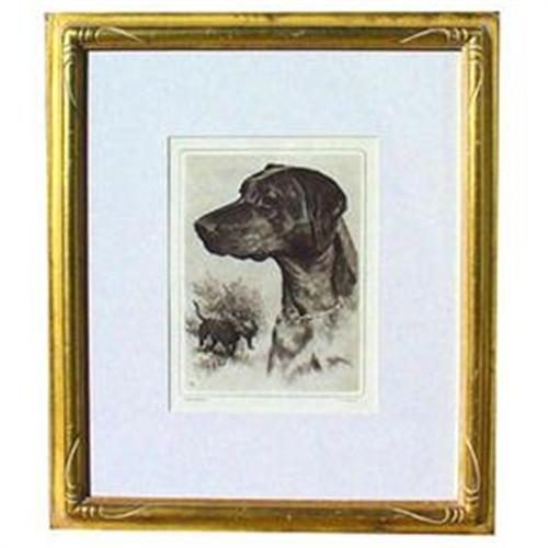 Beautiful etching by R. H. Palenske titled "Black Labrador". This piece is one of the subjects Palenske created for Brown & Bigelow back in 1940-50's era. Excellent condition, framed. Overall framed dimension : 27-1/2 x 23-1/2". Palenske held one man show in Smithsonian and was awarded most coveted prize in etching arts - for the most outstanding work of the year - by Chicago Society of Etchers in 1944. Etchings by Palenske are included in collections in the world's finest galleries such as Smithsonian, Library of Congress, New York Public Library and Royal Gallery of London. Photos for Ebay Live Auctions are reduced and (distorted), if you want to see larger, more detailed pictures, please email us.