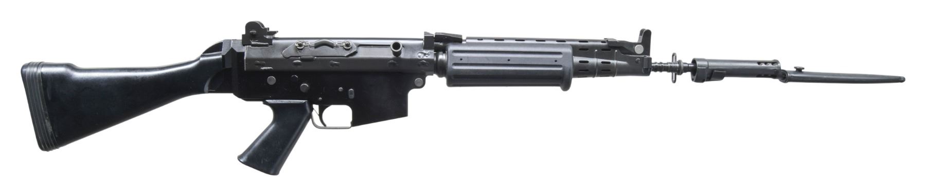 PACKAGING WITH BAYONET & MANUAL. Cal. 223 Rem. S# FN034642. Bbl. 19" over brake. An extremely clean original Belgium manufactured Fabrique Nationale rifle. The FNC, a scaled down & refined variant of the famous FN FAL was imported into the United States until 1987 and remains a rare & desirable rifle to this day. It utilizes a 2 position gas system w/ an integral grenade launcher front sight which functions as a gas shutoff valve when deployed. The gas system is adjusted to send more pressure rearward if the gun should become fouled by rotating the gas tube 90 degrees clockwise. This particular piece was imported by Gun South Inc, from Trussville, AL. The left side safety / selector is marked "S" (safe) / "1" (semi). Matte black finish on all exterior surfaces. Protected post front sight w/ dual aperture rear sight. Fixed, black plastic shoulder stock. Ingenious spring loaded dust cover on right side remains under constant pressure, momentarily lifting during the firing cycle, to immediately be closed again upon firing. Utilizes standard AR-15 magazines. Left side of receiver marked w/ serial number & "FABRIQUE NATIONALE HERSTAL / FNC 5.56 MADE IN BELGIUM / GUN SOUTH, INC. TRUSSVILLE, AL. / CAL. 223 REM SPORTER". UNATTACHED ACCESSORIES: Factory box w/ fitted styrofoam insert, owners manual, bayonet & scabbard. CONDITION: All aspects indicate very little use, if any. Still resides in factory packaging w/ accessories. Finish is complete w/o the typical wear marks from mechanical intervention. Bore is bright w/ strong rifling. Fire control mechanism appears to function correctly when cycled by hand. PROVENANCE: Lifelong Collection of Terrance McCarty. (24-553/JZ). MODERN. $2,500-4,000.