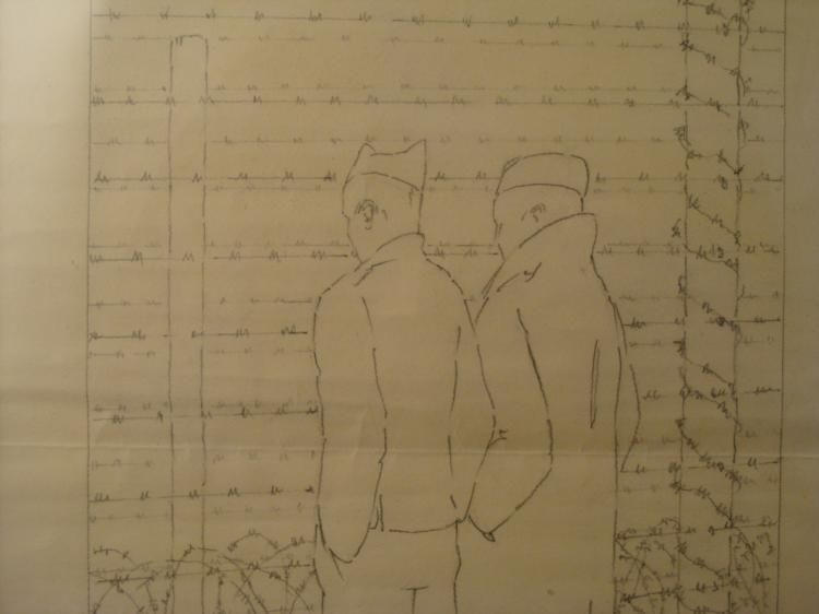 THIS IS AN ORIGINAL FRAMED PENCIL SKETCH BY "T. HOFMANN" ENTITLED "EVOCATION". THIS 14 1/2" X 18" BEAUTIFULLY FRAMED WWII PERIOD PENCIL SKETCH SHOWS TWO LIBERATING U.S. GI'S AT AN ELECTRIFIED BARBED WIRE FENCE AT BERGEN, BELSEN LAGER/CONCENTRATION CAMP. *