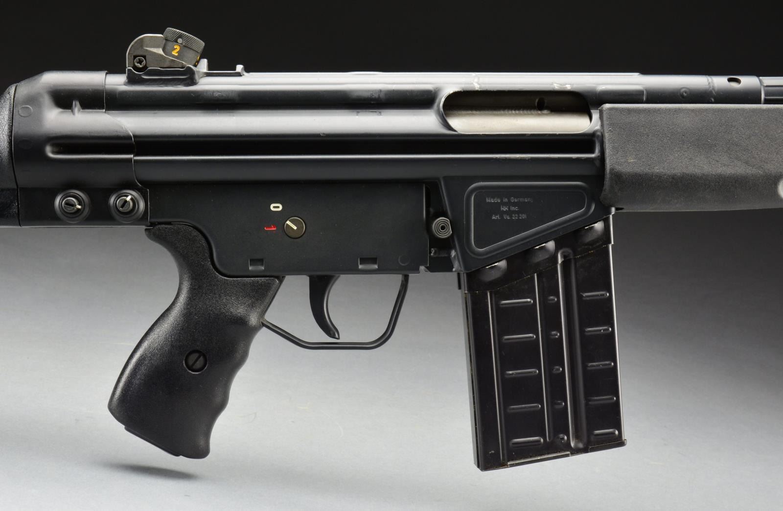 Cal. 308. S# A056217. Bbl. 17.7" w/ factory flash hider. Standard A-2 model w/ black plastic stock set. Includes factory bipod. Factory 4 position drum style rear sight assembly. Hooded post front sight. Push button mag. release w/ 0-1 metal clip on trigger housing. Mag. well right side marked, "Made in Germany, HK Inc., Arl. Va. 22- 201". Left side mag. well marked, "HK91 A038695, Cal..308, eagle IC antler" indicating 1982 mfg. MAGS: 3 aluminum 20 rd. UNATTACHED ACCESSORIES: HK heavy padded transport bag. CONDITION: light black factory paint on all exposed metal surfaces remains consistent & correct. Light thinning in areas that coincide w/ scope mt. use. Furniture free of any noticeable outward defect. Bipod folds correctly & locks tight both in open & closed position. Bore is shiny w/ well pronounced rifling & fire control mechanism appears to function correctly when cycled by hand. (21-771/JZ). MODERN. $1,800-2,500.