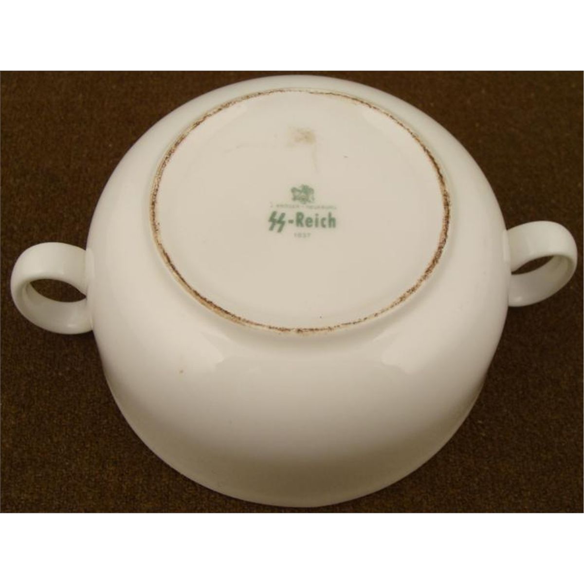 ORIGINAL GERMAN SS - REICH DOUBLE HANDLE SERVING BOWL-MARKED: 1937-J KROGER-NEUEBURG * RARE ORIGINAL "SS-REICH" DINING HALL SERVING BOWL--BOTTOM MARKED : SS REICH-1937-J.KROGER-NEUEBURG.--SERVING BOWL FROM SS DINING HALL-DIAMETER 4 3/8"--2 1/4" HIGH--HAS A HANDLE ON EACH SIDE-HAS A WELL DONE PERIOD REPAIRED LARGE CRACK IN THE SIDE--DIFFICULT TO FIND ORIGINAL EARLY SS PIECE *
