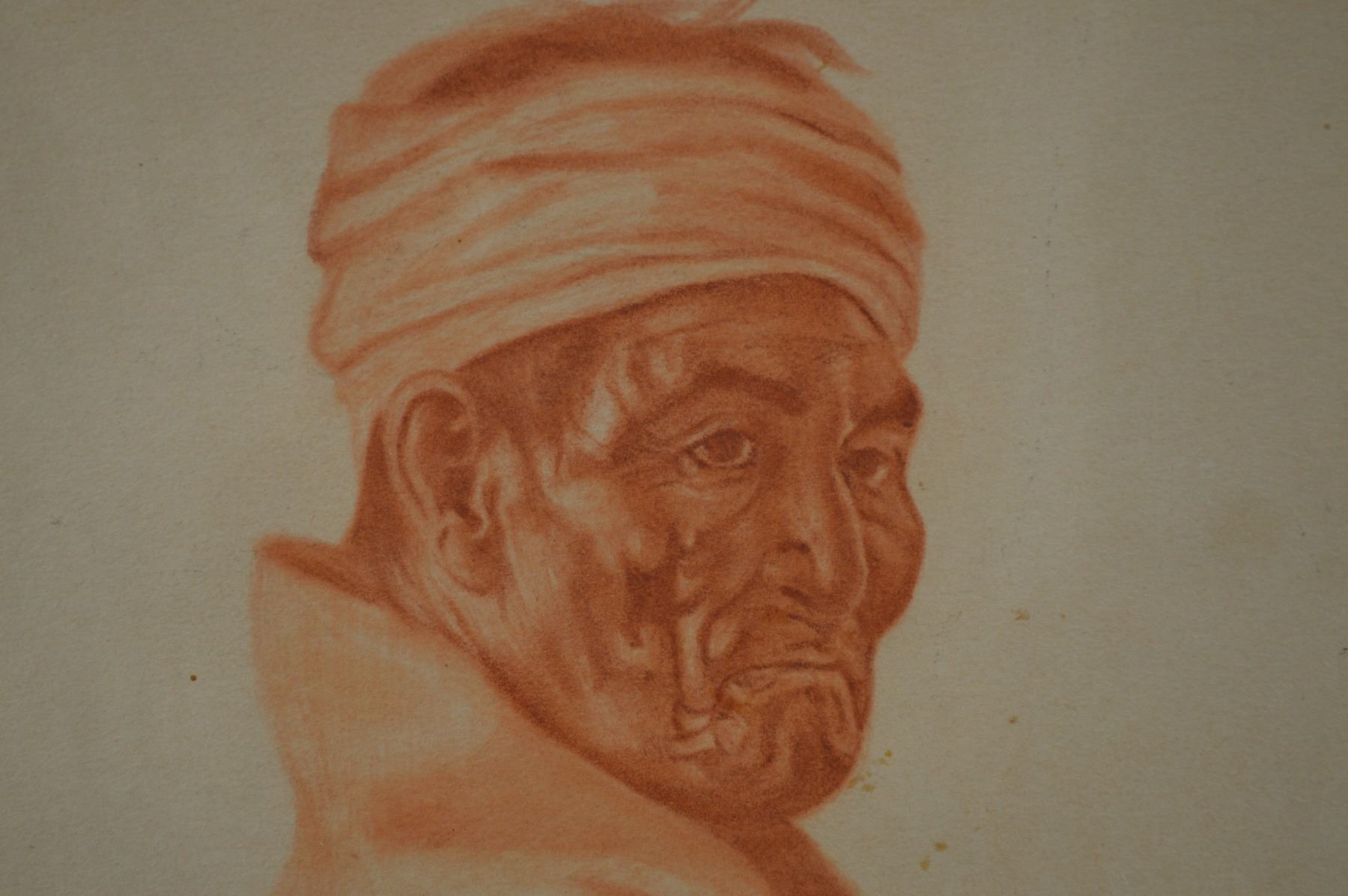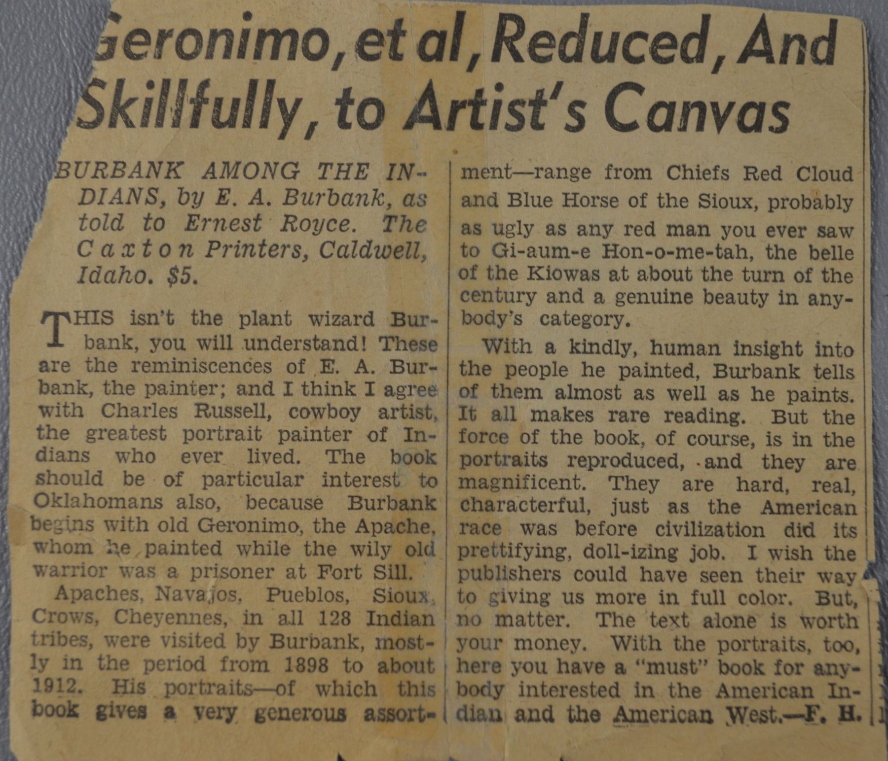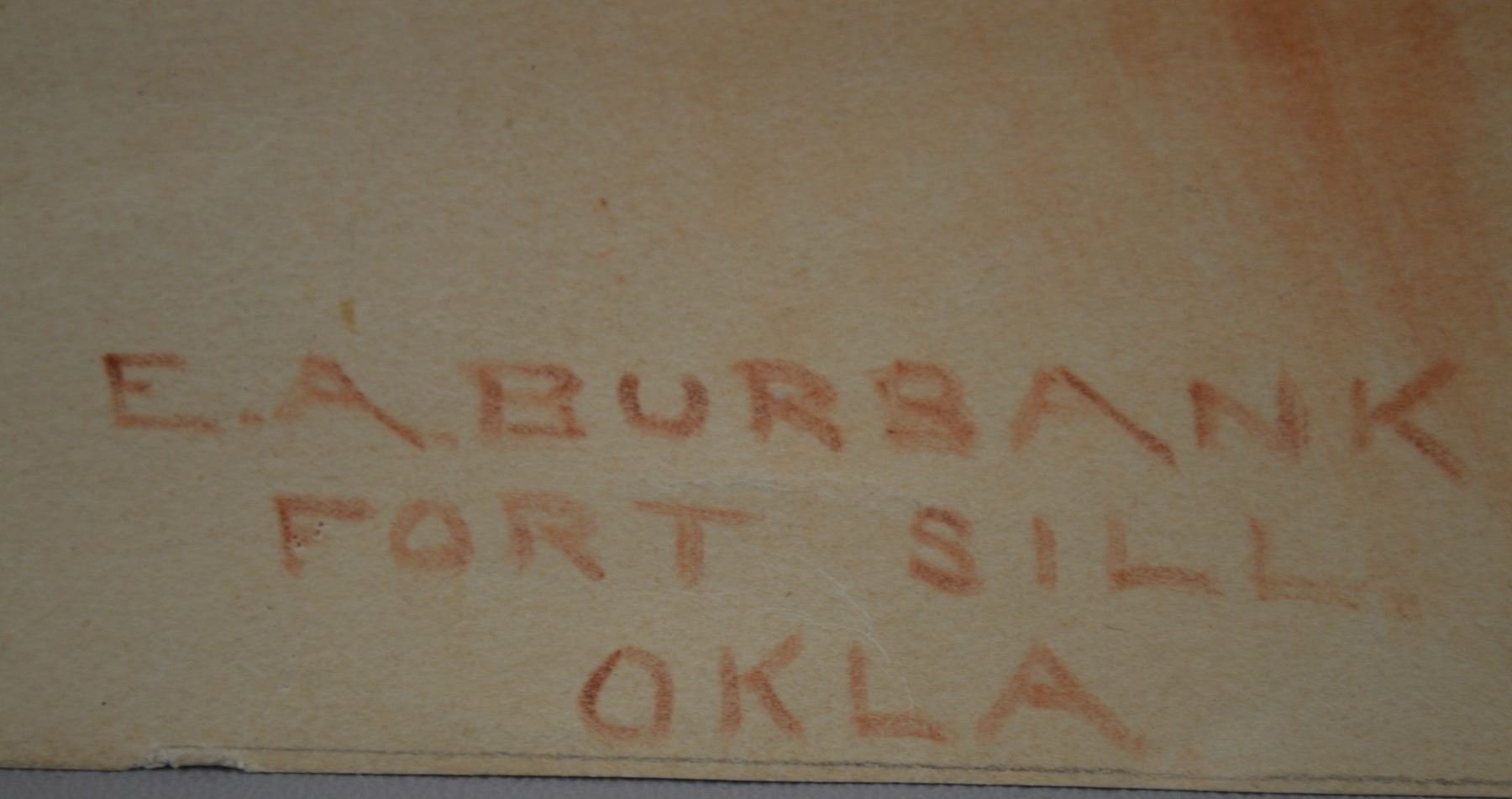 1897. Hand drawn portrait of Geronimo. Drawn while Prisoner of War at Fort Sill Oklahoma. Signed with location E. A. Burbank, Fort Sill Okla. (Elbridge Ayer Burbank, is the only known artist to have drawn Geronimo while he was living)