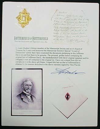 ORIGINAL HAIR OF JEFFERSON DAVIS IN MINIATURE GUILT FRAME W/ PROVENANCE DOC.'S. - Comes w/ copy of original letter from Thos. Placide telling how the hair was obtained. Comes w/ letter of authenticity from William C. Floyd. Original receipt and lifetime authenticity warranty from Louis Mushro.