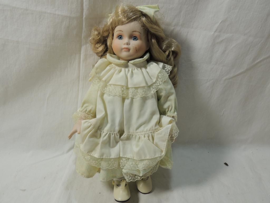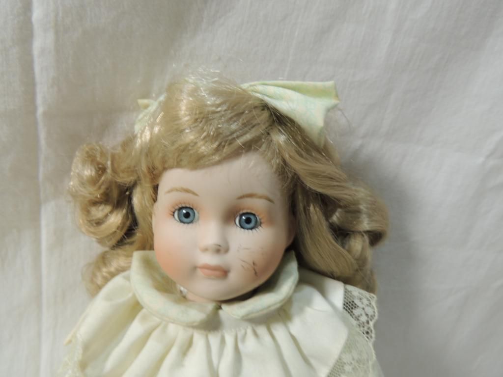 IN ORIGINAL BOX. ORIGNIAL HEIDI OTT SWISS DESIGN HANDMADE BLONDE LONG HAIR IN RINGLET CURLS BLUE EYES. LIGHT CREAM AND GREEN FLORAL DRESS WITH CREAM AND LACE APRON. 12" TALL. AS SHOWN. SEE PHOTO FOR MORE DETAILS.