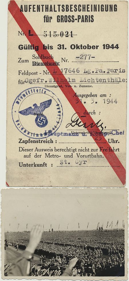 Two items from a German private, the first an original photo, 3 1/4" x 3 1/2" b/w of a Nazi Party rally, undoubtedly at Nuremburg, showing perhaps 100,000 people but in the foreground one sees Adolf Hitler in his car returning the salute of the crowd, with an SS man in the back seat, possibly Himmler. Also included is a permit for the private to reside in Paris, issued on Mar. 31, 1944, valid until Oct. 31, 1944, with curfew hours printed on verso. Both are fine. Paris would be liberated on Aug. 19, 1944, cutting short the private's party time.